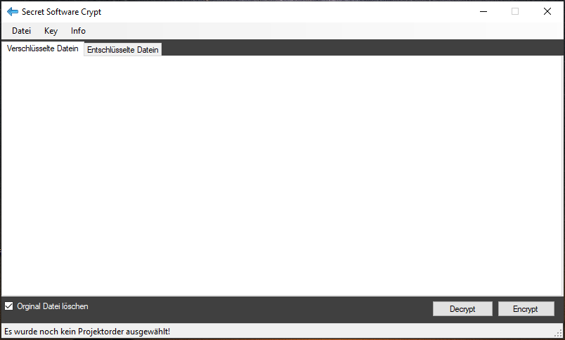 Legen Sie ein Projektordner für Ihre Dateien an. Danach können Sie dateien einfach verschlüsseln oder enschlüsseln. Sie können Ihren Public Key in ein Textfile exportieren, damit andere Personen auch dataienen an Sie verschüsseln können.